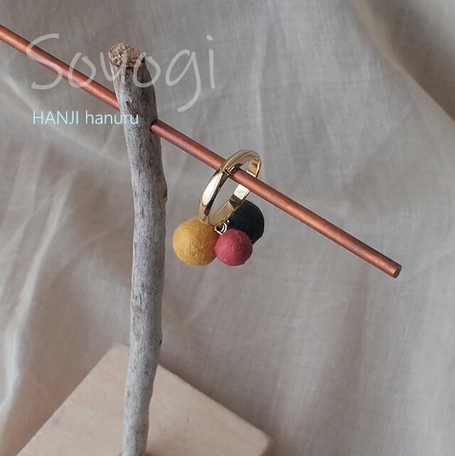 山吹色(やまぶきいろ)、深みのある織部(おりべ)、黄みがかった銀朱(ぎんしゅ)の組み合わせです。